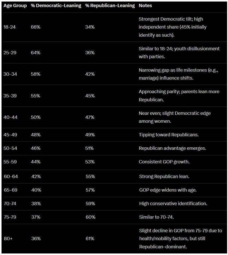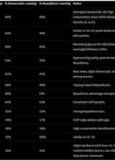 By Age: Younger Americans (18-29) lean Democratic due to exposure to progressive education on climate change, racial equity, and LGBTQ+ rights, plus economic insecurity from student debt and gig work—issues Democrats address more directly. High independent rates (45%+) reflect distrust in institutions post-2008 recession and social media echo chambers. As people age into their 30s-50s, life events like homeownership, marriage, and parenthood shift priorities toward fiscal conservatism and stability, boosting Republican affiliation (e.g., parents are 10 points more GOP-leaning). Older adults (65+) favor Republicans due to entrenched conservatism from Cold War-era socialization, higher religiosity, fixed incomes benefiting from Social Security (framed as anti-entitlement by GOP critics), and resistance to social changes like immigration. Generational cohorts "age" their views: Millennials hold Democratic tilts, while Boomers/Silent Generation solidify Republican ones.